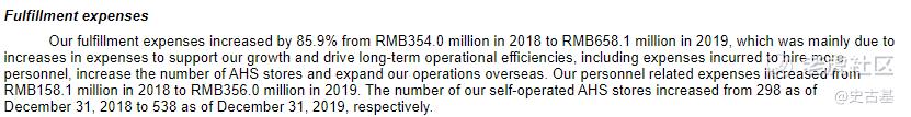 招股书第11页提到爱回收于2017年3月开始拓展海外市场的业务,在香港成立了AHS Device Hong Kong。第123页提到公司的履约费用从2018年的3.54亿元增到2019年的6.581亿元,增幅85.9%,主要是推动公司运营,包括雇佣更多的员工,增加AHS门店并且扩大海外业务。AHS自营的门店从2018年的298家增加到2019年的538家。