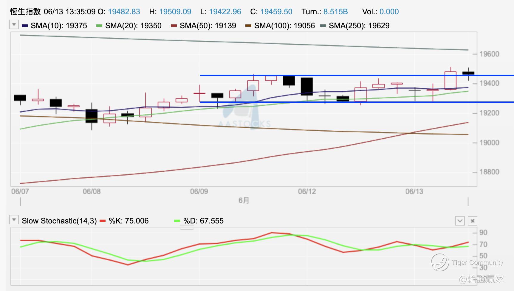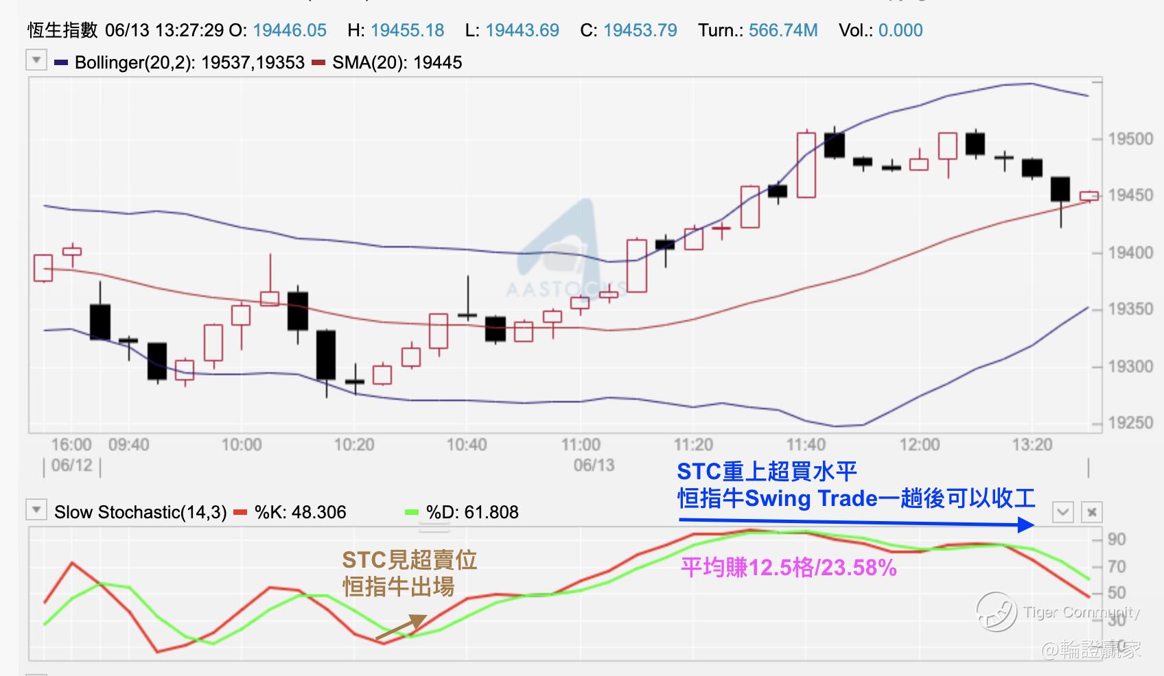 挨过呢个位之后, $HSI(HSI)$ 慢慢的重上保历加上升通道,唔紧要,成日都话慢系无乜所谓,只要方向啱就可以架啦。去到11点,保历加通道口忽然拓阔,指数揿都揿唔住单咁直奔19500点楼上,上破小时图「平顶」兼「长方形」顶线,Slow STC(14,3)就更系跟住上啦,由11点20分至下半场返嚟嘅1点20分,期间Slow STC(14,3)两线都系处于超买至严重超买范围。轻松走(66061)的话,以期内高低位0.071元/0.06元计,平均走货价为0.0655元,呢一趟平均赚幅有12.5格或23.58%。