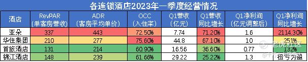 除了入住率OCC为72.5%,略低于华住的75.6%以外,亚朵一季度的单客房营收(RevPAR)/客房平均单价(ADR)/入住率(OCC)/营收增长率/净利润增长率,均在这四家企业中排名第一。