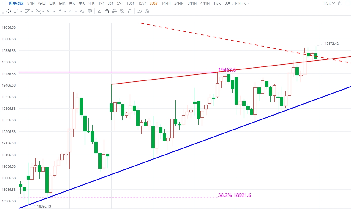 恒指$恒生指数(HSI)$ 今天低开探底反弹,盘中再创本轮反弹新高。恒指今天最低19273点,短期支撑位与盘前Jep Morning节目分析的点数几乎完全吻合。支撑位不破,反弹继续。截至收盘,恒指站上19452压力,可惜没能确认有效突破22700与20864两高点连线形成的下降轨的压制。短期行情如图所示,恒指突破楔形上轨,突破的压力变支撑,突破了就不能再跌回去。所以明天恒指首先注意19452支撑,其次注意蓝色上涨轨的支撑,以及注意能否突破22700与20864两高点连线形成的下降轨(大约19540点)压力,后市注意真正突破的方向。