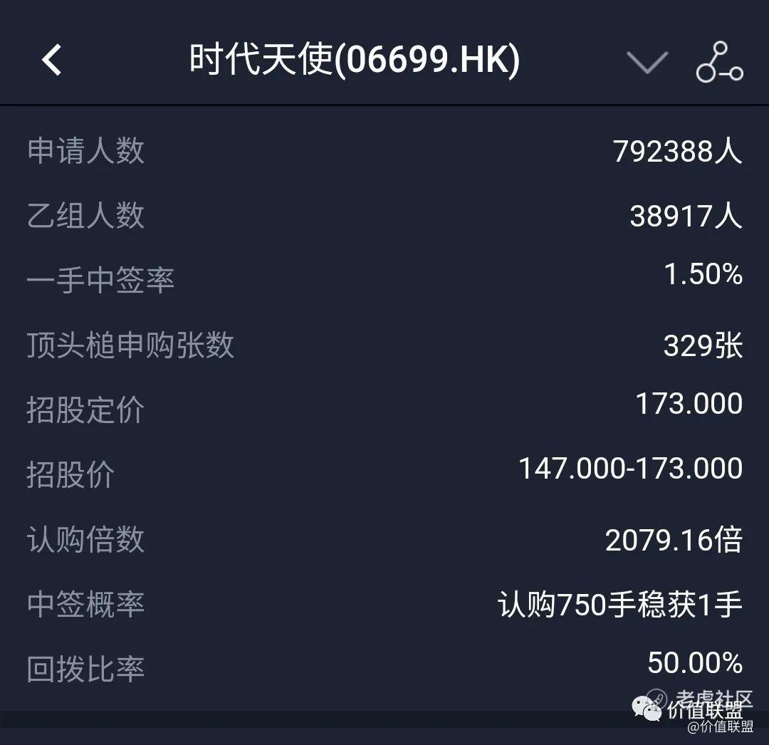 时代天使公开发售总申购数79.23万人,公开发售超购2079倍,申购人数虽然低于预期的100万以上,但这个申购人数,在如此高的一手入场费下,还是非常高了,一手中签率1.5%,低于诺辉健康的2%,申购759手稳中一手,最高回拨至50%,招股价格定价173元,定价处于最高