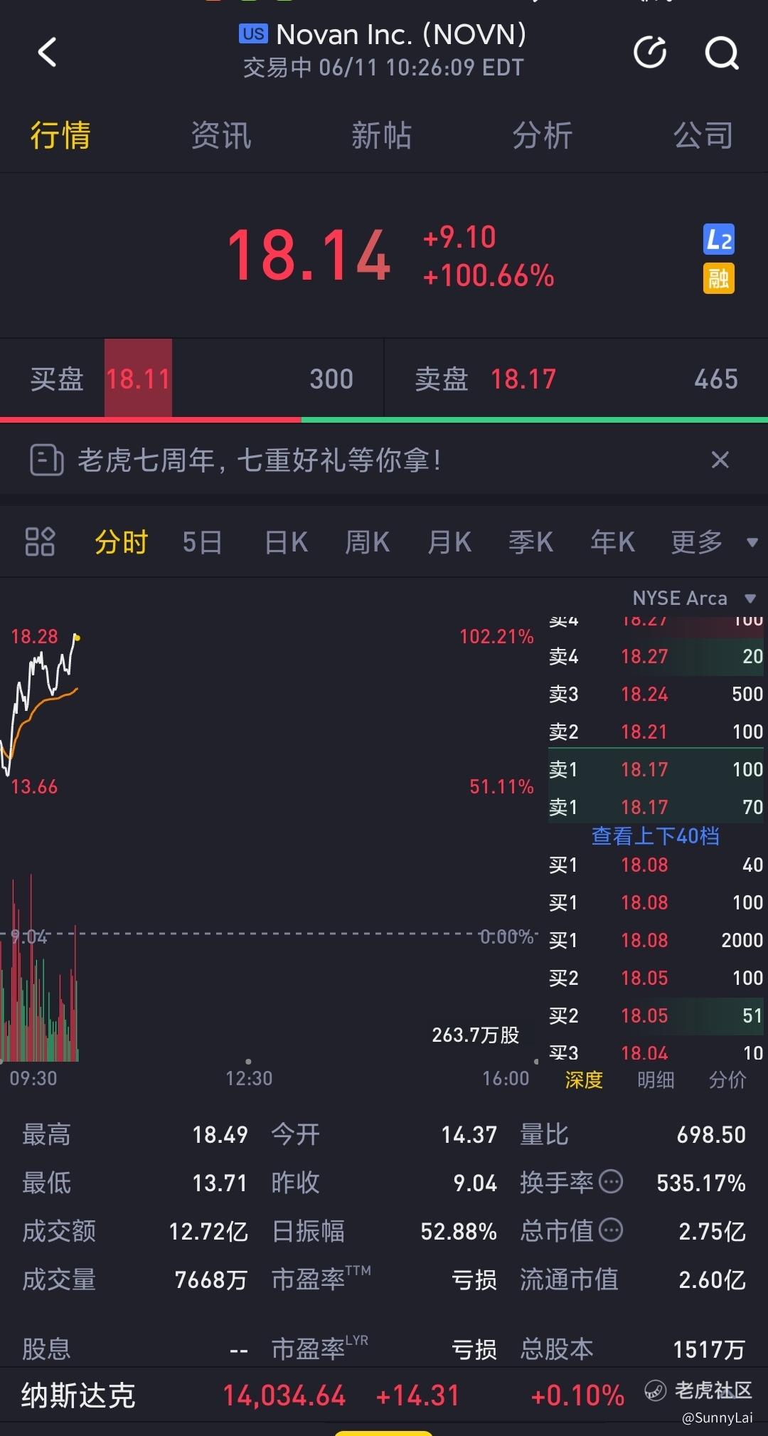 今天盘前也没太多动静,但一开盘给我大大惊喜,跳高60%开盘,一路上蹿在,不到1小时即达峰值18.68元,107%涨幅。见势很对之下,18.00元减半,留一半继续追梦吧,不枉等你12天!