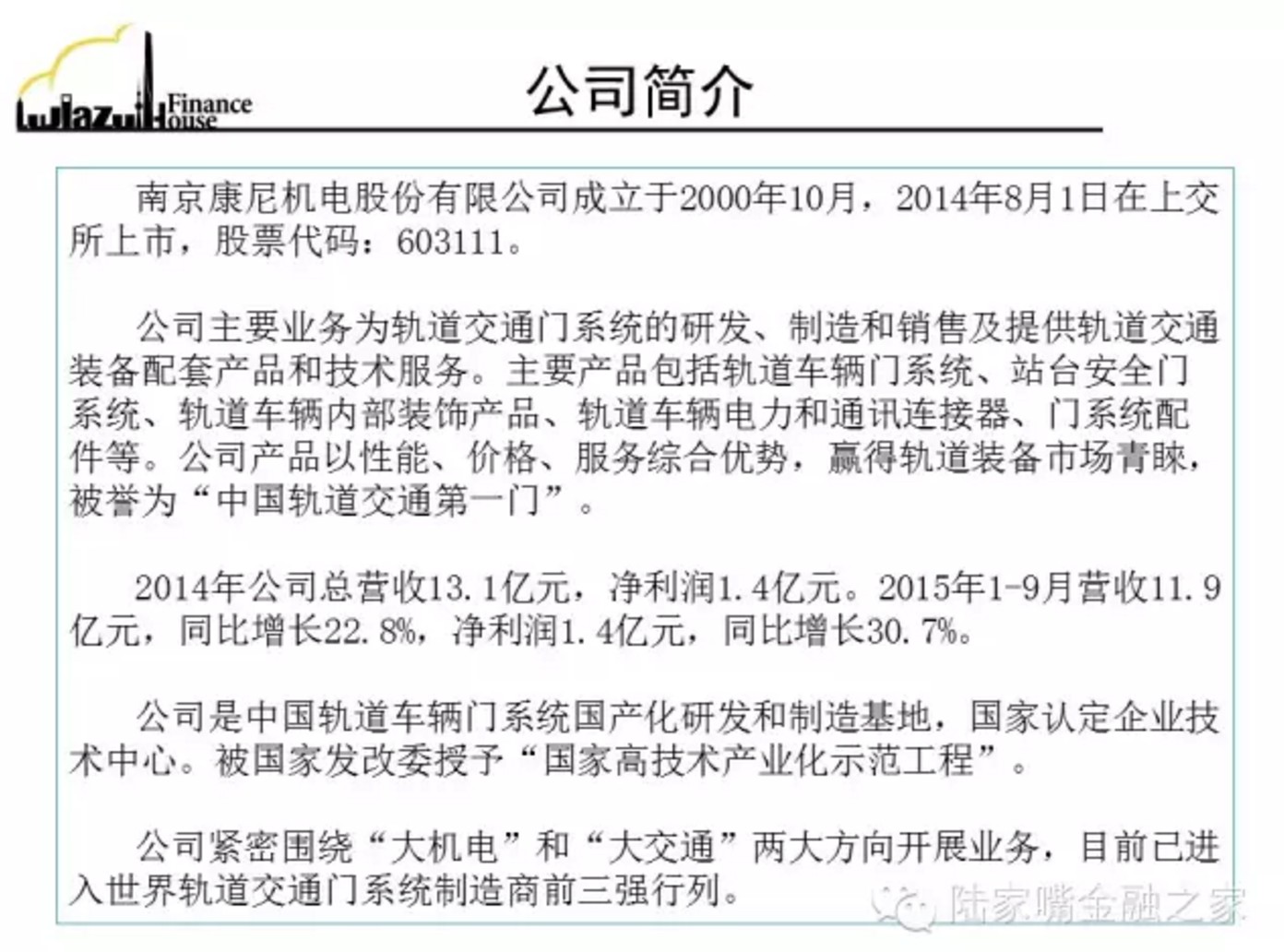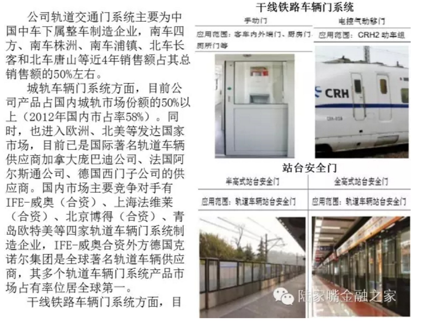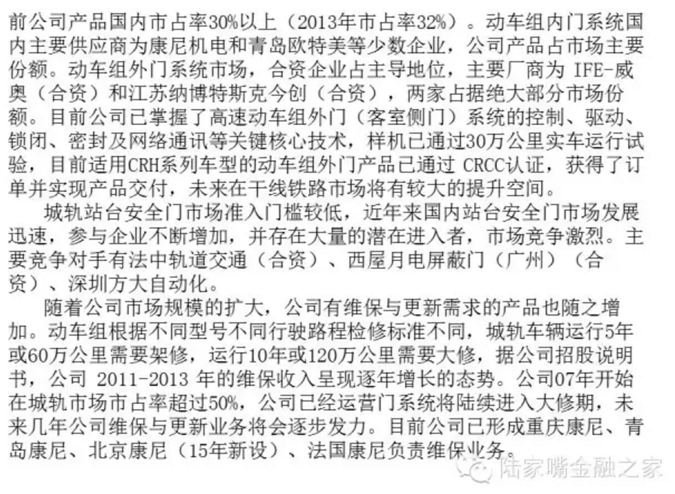 {"i18n":{"language":"zh_CN"},"detailType":1,"isChannel":false,"data":{"magic":2,"id":18877,"tweetId":"18877","gmtCreate":1467172815743,"gmtModify":1704871795241,"author":{"id":34552322514512,"idStr":"34552322514512","authorId":34552322514512,"authorIdStr":"34552322514512","name":"陆家嘴金融之家","avatar":"https://static.laohu8.com/tiger_upload_file_1449305803.png","vip":1,"userType":1,"introduction":"","boolIsFan":false,"boolIsHead":false,"crmLevel":1,"crmLevelSwitch":0,"individualDisplayBadges":[],"fanSize":198,"starInvestorFlag":false},"themes":[],"images":[{"img":"https://static.laohu8.com/ea0796068e52fd564de12953b1c8dccd"},{"img":"https://static.laohu8.com/13e1aab265b4ba14c0f1f1ea246be3a4"},{"img":"https://static.laohu8.com/198c0489dd945a76c04e5b3add0bde3d"},{"img":"https://static.laohu8.com/d581353de1243ff5996090c4f88ca2eb"},{"img":"https://static.laohu8.com/cb2e7590c1296bf9ec5992854876dc44"},{"img":"https://static.laohu8.com/ba98cda0c5becef4534fff75570db708"},{"img":"https://static.laohu8.com/a10d9899169c6faf4bb3ef46aa3bc3d4"},{"img":"https://static.laohu8.com/ee5ed27294c717bf97e5656880e20502"},{"img":"https://static.laohu8.com/c6266f3450774f121a6f9d4575221a6e"},{"img":"https://static.laohu8.com/b74ff4c62cb9c640aaad75150458ff2c"},{"img":"https://static.laohu8.com/e34b6a2b99299aab1c0e558b34da45d1"},{"img":"https://static.laohu8.com/558dcd2bd123ab7f3a4da1b8315e9c21"},{"img":"https://static.laohu8.com/1c2f796ac25dbbbabc98fad774ce4bc5"},{"img":"https://static.laohu8.com/77e4c3f5393092ea3278a1d6c11fc825"},{"img":"https://static.laohu8.com/8a90583fe820202145e426a55116c888"},{"img":"https://static.laohu8.com/c67d0054fff07b04eaa4facd3e86559f"},{"img":"https://static.laohu8.com/490dbb7d0e2d922fcd78741a065f9e1e"},{"img":"https://static.laohu8.com/fe71f91023457b563d5d91b1a8e99c77"},{"img":"https://static.laohu8.com/897d9823e9c02d3b15c0924a4a0e9a14"},{"img":"https://static.laohu8.com/8b30079ff7f7ab0831fa289a3ad90f1c"},{"img":"https://static.laohu8.com/73b46cd5f4242e46fa26b832e17d2672"},{"img":"https://static.laohu8.com/03c97950a240d1cb9d13d618232c8e4b"},{"img":"https://static.laohu8.com/7520ae5b5edcdceaa82b8c8d636f0eb2"},{"img":"https://static.laohu8.com/5ab6592272d2c3159379f295c7b2ae62"},{"img":"https://static.laohu8.com/863bba034c7bff6e82c715da93448a2a"},{"img":"https://static.laohu8.com/956d5185457c8bbcdc3692c7aa5751d9"},{"img":"https://static.laohu8.com/8c62624eb31e9d4d31a329f2c7df67d6"},{"img":"https://static.laohu8.com/9b8aba7ec8ce72fd72bdc6196dac902f"},{"img":"https://static.laohu8.com/847144d11d67ca9ef0dde99ade51f6b4"},{"img":"https://static.laohu8.com/4b43160dd8909d6e7c0030909ff8d667"}],"coverImages":[{"img":"https://static.laohu8.com/ea0796068e52fd564de12953b1c8dccd"},{"img":"https://static.laohu8.com/13e1aab265b4ba14c0f1f1ea246be3a4"},{"img":"https://static.laohu8.com/198c0489dd945a76c04e5b3add0bde3d"}],"title":"【公司的力量】 康尼机电 (603111.SH)","extraTitle":"","html":"<html><head></head><body><p><img src=\"https://static.laohu8.com/fe71f91023457b563d5d91b1a8e99c77\"></p> <p><em>上海米牛投资管理有限公司 中国智造小组 黄自力</em></p> <p>康尼机电$(603111)$主要业务为轨道交通门系统的研发、制造和销售及提供轨道交通装备配套产品和技术服务,被誉为“中国轨道交通第一门”。</p> <p><img src=\"https://static.laohu8.com/8c62624eb31e9d4d31a329f2c7df67d6\"></p> <p><img src=\"https://static.laohu8.com/c67d0054fff07b04eaa4facd3e86559f\"></p> <p><img src=\"https://static.laohu8.com/ee5ed27294c717bf97e5656880e20502\"></p> <p><img src=\"https://static.laohu8.com/cb2e7590c1296bf9ec5992854876dc44\"></p> <p><img src=\"https://static.laohu8.com/8b30079ff7f7ab0831fa289a3ad90f1c\"></p> <p><img src=\"https://static.laohu8.com/5ab6592272d2c3159379f295c7b2ae62\"></p> <p><img src=\"https://static.laohu8.com/863bba034c7bff6e82c715da93448a2a\"></p> <p><img src=\"https://static.laohu8.com/13e1aab265b4ba14c0f1f1ea246be3a4\"></p> <p><img src=\"https://static.laohu8.com/198c0489dd945a76c04e5b3add0bde3d\"></p> <p><img src=\"https://static.laohu8.com/77e4c3f5393092ea3278a1d6c11fc825\"></p> <p><img src=\"https://static.laohu8.com/897d9823e9c02d3b15c0924a4a0e9a14\"></p> <p> <img src=\"https://static.laohu8.com/956d5185457c8bbcdc3692c7aa5751d9\"></p> <p><img src=\"https://static.laohu8.com/c6266f3450774f121a6f9d4575221a6e\"></p> <p><img src=\"https://static.laohu8.com/ba98cda0c5becef4534fff75570db708\"></p> <p><img src=\"https://static.laohu8.com/d581353de1243ff5996090c4f88ca2eb\"></p> <p><img src=\"https://static.laohu8.com/ea0796068e52fd564de12953b1c8dccd\"></p> <p><img src=\"https://static.laohu8.com/8a90583fe820202145e426a55116c888\"></p> <p><img src=\"https://static.laohu8.com/b74ff4c62cb9c640aaad75150458ff2c\"></p> <p><img src=\"https://static.laohu8.com/847144d11d67ca9ef0dde99ade51f6b4\"></p> <p><img src=\"https://static.laohu8.com/558dcd2bd123ab7f3a4da1b8315e9c21\"></p> <p><img src=\"https://static.laohu8.com/1c2f796ac25dbbbabc98fad774ce4bc5\"></p> <p><img src=\"https://static.laohu8.com/73b46cd5f4242e46fa26b832e17d2672\"></p> <p><img src=\"https://static.laohu8.com/03c97950a240d1cb9d13d618232c8e4b\"></p> <p><img src=\"https://static.laohu8.com/490dbb7d0e2d922fcd78741a065f9e1e\"></p> <p><img src=\"https://static.laohu8.com/9b8aba7ec8ce72fd72bdc6196dac902f\"></p> <p><img src=\"https://static.laohu8.com/a10d9899169c6faf4bb3ef46aa3bc3d4\"></p> <p><img src=\"https://static.laohu8.com/7520ae5b5edcdceaa82b8c8d636f0eb2\"></p> <p><img src=\"https://static.laohu8.com/e34b6a2b99299aab1c0e558b34da45d1\"></p> <p><img src=\"https://static.laohu8.com/4b43160dd8909d6e7c0030909ff8d667\"></p></body></html>","htmlText":"<html><head></head><body><p><img src=\"https://static.laohu8.com/fe71f91023457b563d5d91b1a8e99c77\"></p> <p><em>上海米牛投资管理有限公司 中国智造小组 黄自力</em></p> <p>康尼机电$(603111)$主要业务为轨道交通门系统的研发、制造和销售及提供轨道交通装备配套产品和技术