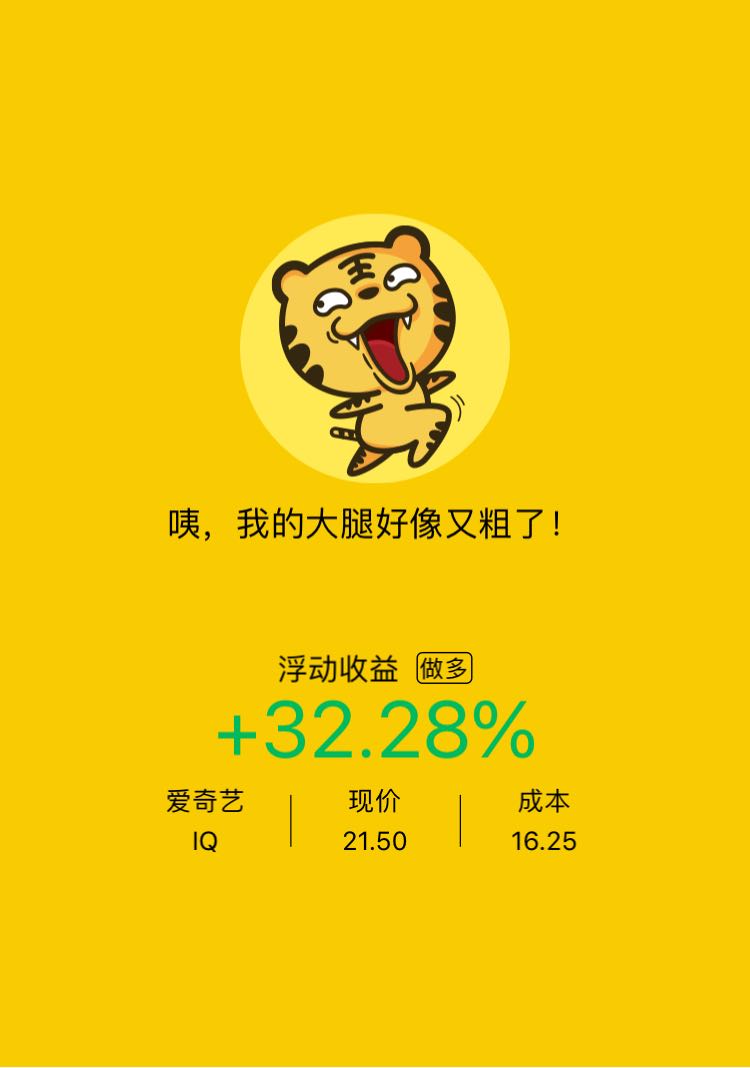 $爱奇艺(IQ)$ ,这两天的连续上涨,我确实有点看不懂,而且目前盈利也可以了,打算卖掉一半,但我是长期(以10年计)看好爱奇艺的,另外加上自己目前只有一半仓位,如果真跌了,就补仓吧,期权是不会碰的,期权的100次盈利可能一次亏损就全部化为乌有了