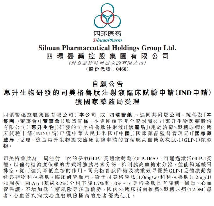 四环医药日前发布公告,该集团旗下非全资附属公司惠升生物研发的司美格鲁肽注射液用于治疗2型糖尿病的临床试验申请(IND申请)已获中国国家药品监督管理局(国家药监局)受理,这是惠升生物提交临床实验申请的首个胰高血糖素样肽-1(GLP-1)类似物。