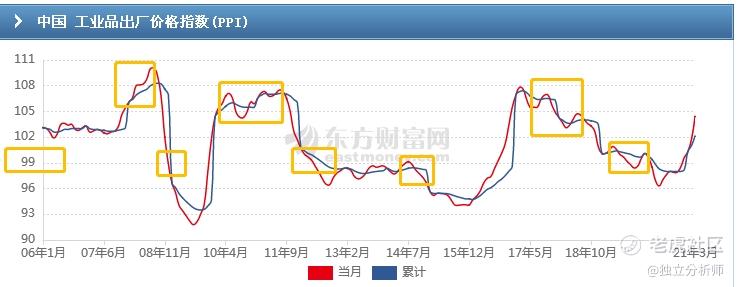 2.通胀压力加大。近期PPI高起,CPI虽然稳定,但仅仅是权重最大的猪肉价格下降,使CPI未出现明显升高。但大量生活用品已经大幅上涨,目前的CPI有失真。从PPI走势图,配合历史A股行情,可以发现:当PPI从100下跌低于99时,往往会出现较好的行情;当PPI从100上升打到105时,会出现较大深跌的行情。如下图所示: