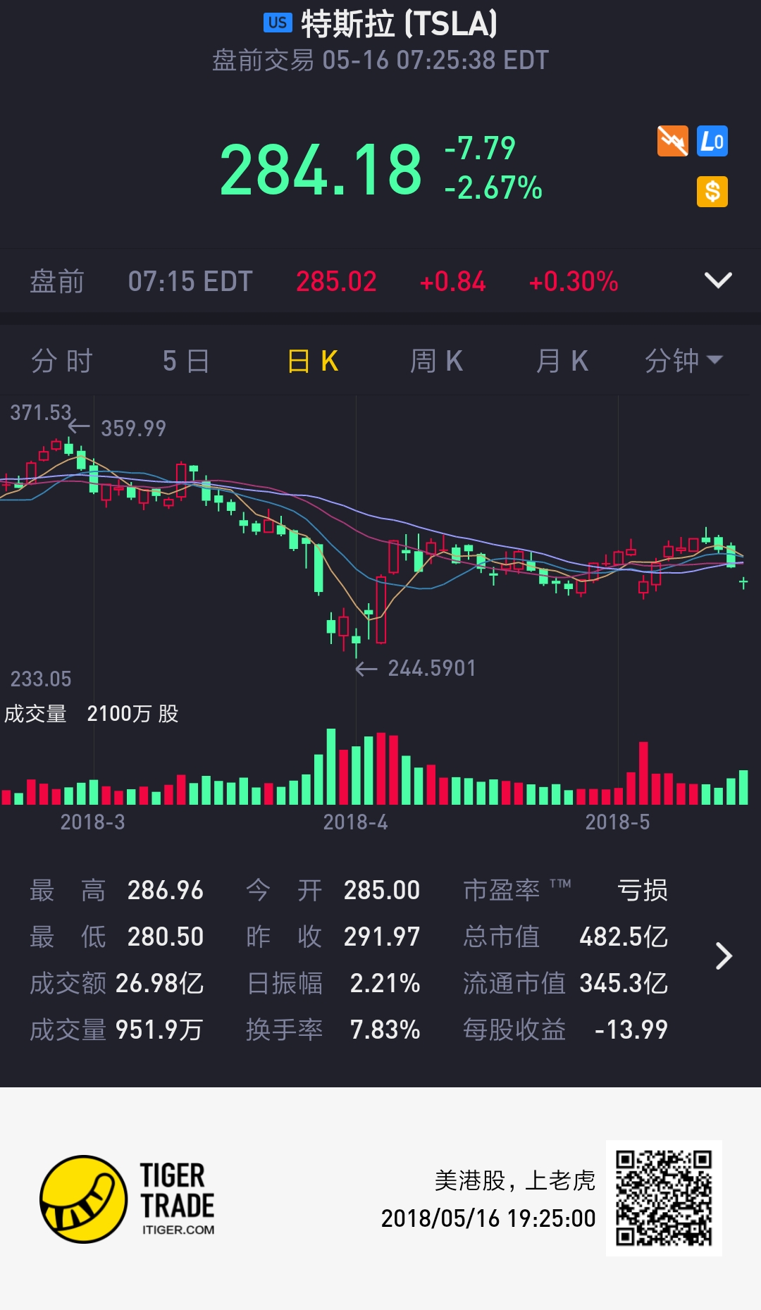 特斯拉 $(TSLA)$ 昨天晚上跌3.87%,收盘284.18美元,成交量为951.9万!