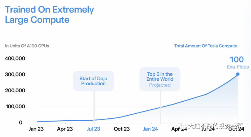 但是恐怖的是在后面,24年1月,要达到10万张A100卡的规模,是现在的6倍,到明年10月,可以达到30万张A100的规模。如果算力等于智力的话,那到明年10月,Dojo的智力是现在ChatGPT的180倍,怪不得马斯克说机器的智能要超过人类1000倍,当然,不能这么简单线性推理,还有算法等。