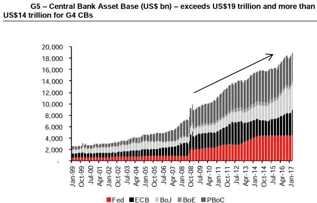 5大央行(美国,欧元区,日本,英国,中国)资产负债表不断膨胀: