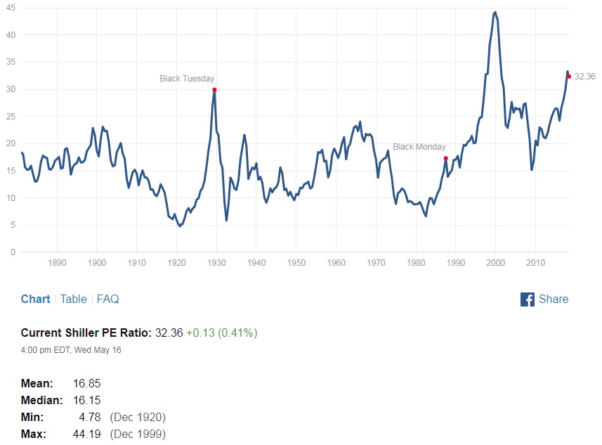 由于各央行的货币宽松导致的大量现金很多都用来投资证券市场了,以至于现在的标普500席勒PE值早超过了2007年的峰值,已经超过了1930年的“黑色星期二”峰值30,截止2018年5月16号,已经达到了32.36, 仅次于2000年科技股泡沫: