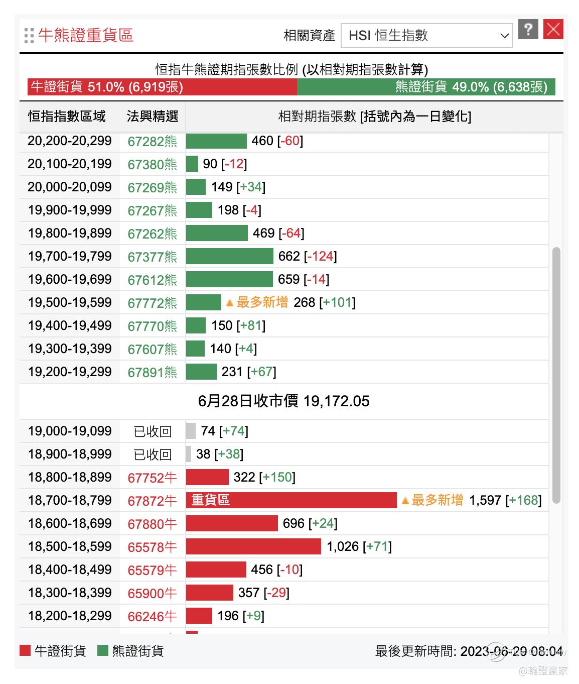 至于熊证方面,暂时未见有新熊街货层出现,今日新增嗰两只都仲系喺19200至19299点嘅街货层里面,换言之听日返嚟会见到最贴价熊为19200至19299点,而牛证则为18800至18899点(如果今日18800点守得住的话),咁计都只系争四层街货左右,未算擘到好阔,至少唔系早几日见到嘅争成800至900几点距离先啦。