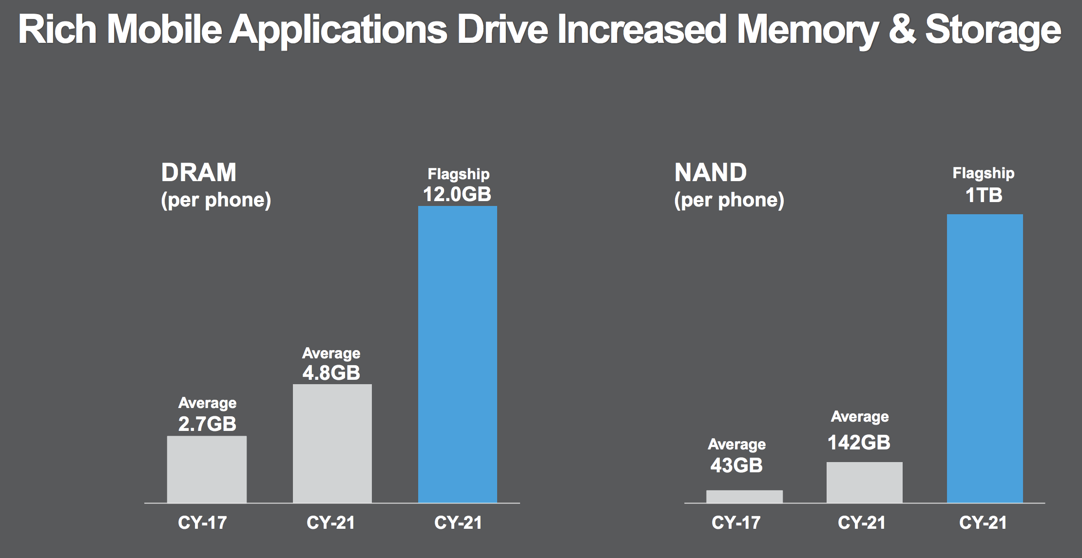 对于DRAM来说,旗舰手机翻了4倍;对于NAND来说,旗舰手机需要1TB的内存。在演讲期间,美光特意提到了中国的手机OEM商,已经在今年开始卖1TB内存的手机了(这不就是锤子嘛)。而且中国的手机商寻求为手机提供更大的DRAM内存。他说中国人对手机配置有着莫名的追求,😄