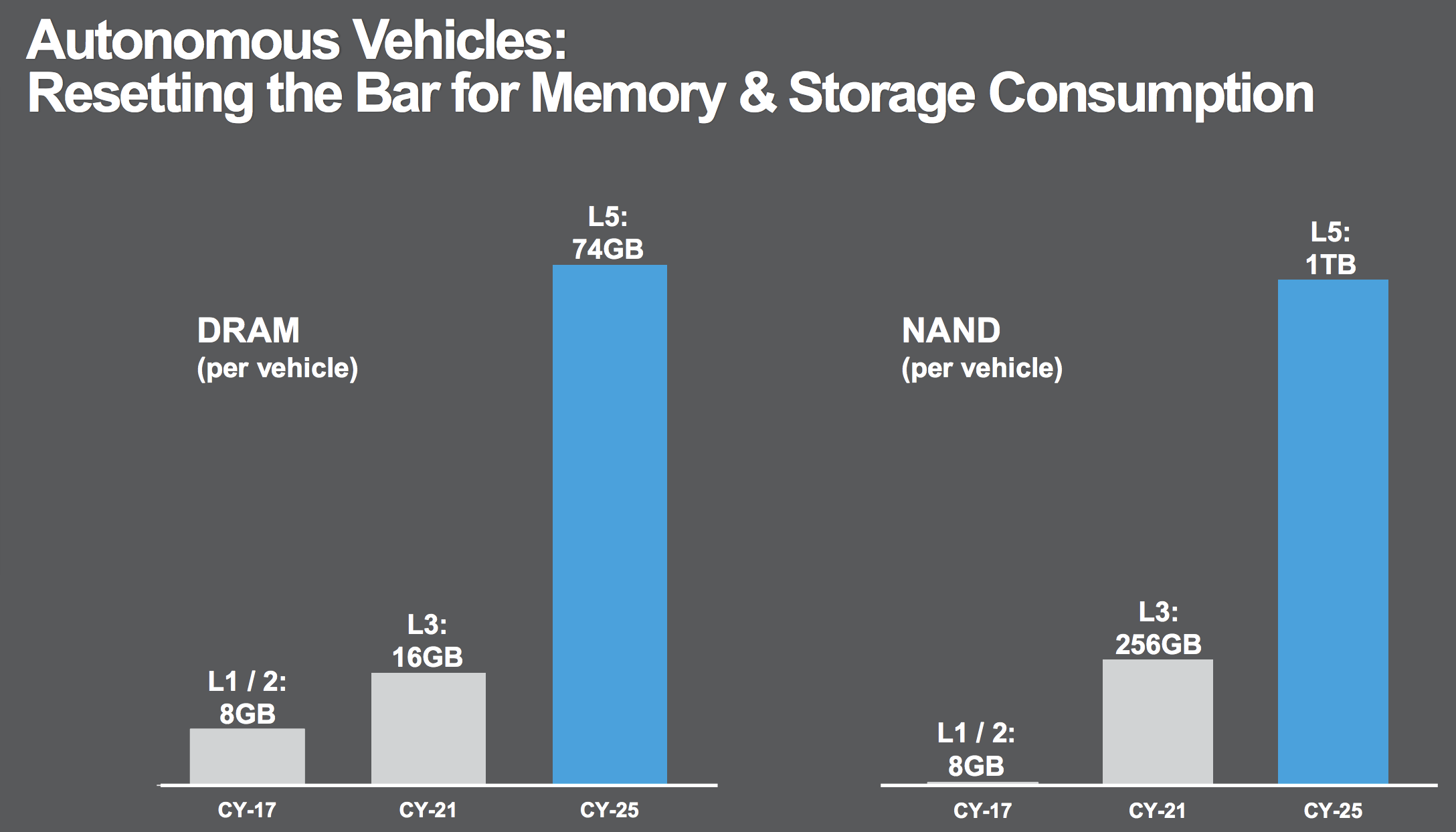 美光告诉你,如果智能达到L5级别,每一辆车需要74GB的DRAM内存和1TB的NAND内存。这个规模分别是如今的10倍和128倍,前提是我们可以在2025年实现L5级别的自动驾驶。(老黄,肩上任务重啊)