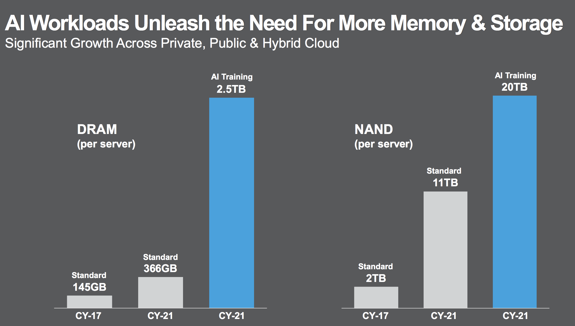从上图可以看出,每个服务器做AI Training,在2021年需要2.5TB的DRAM和20TB的NAND。看了一眼Facebook的Big Basin,很可能都不到50GB的DRAM,由此可见到21年2.5TB的DRAM需求增长是可怕的。