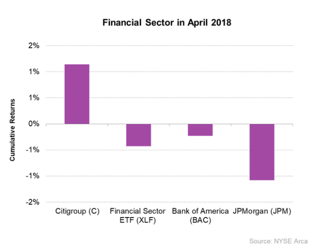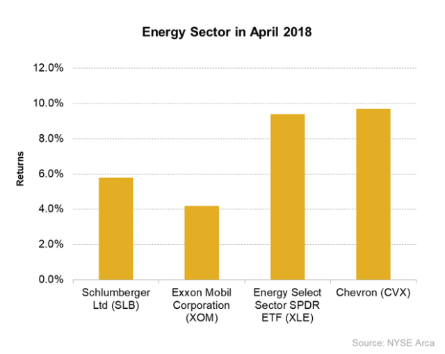 能源股的扎实上涨,得益于油价的大涨。$(WTI)$原油期货合同价在2018年4月上涨了5.6%,并实现前4个月12%的涨幅。美国原油ETF $(USO)$,在2018年4月也上涨了5.4%。