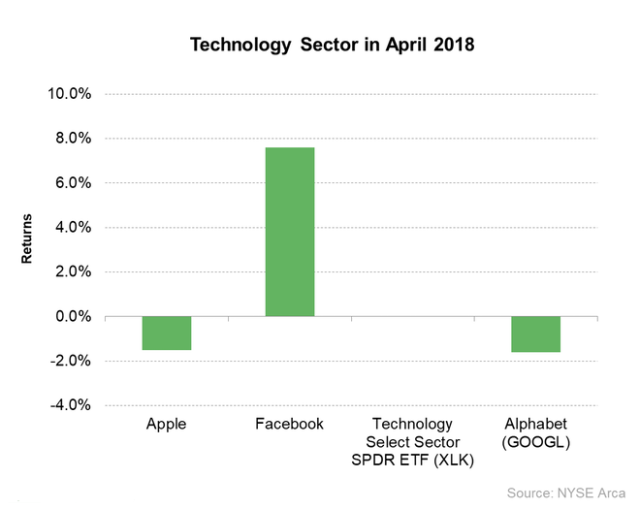 科技股大盘在4月没什么起色。代表性的ETF如$(XLK)$,在4月只上涨了0.01%,其中,脸书$(FB)$的反弹贡献很大: