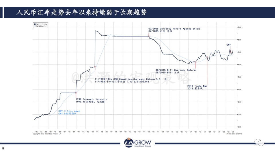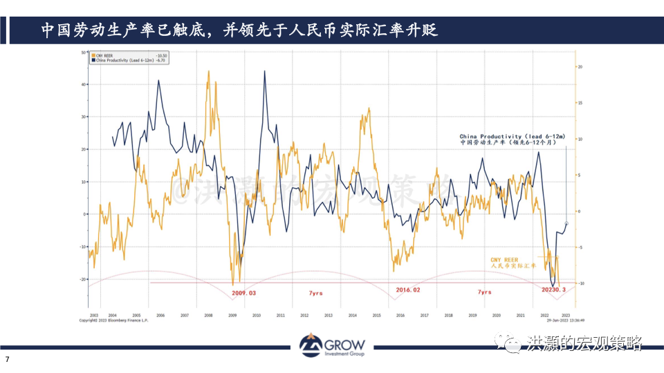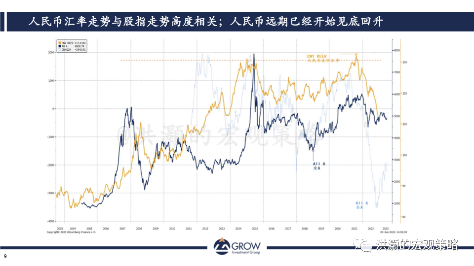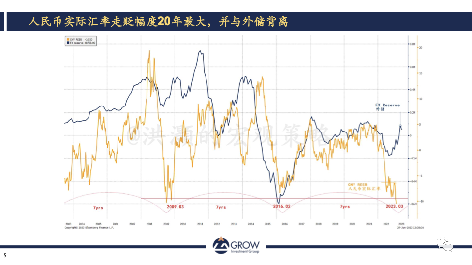 当然,周期不是闹钟,以中周期为时间尺度来衡量短期的汇率波动很容易便会谬以千里。人民币实际汇率运行到周期的低点也并非意味着人民币重新走强一蹴即至(图三)。但显然,继续大幅走贬的空间已经不大了。在今年5月22日发布的下半年展望报告《洪灏 | 2023年下半年展望:进则无咎》中,我详细地分析了几种周期复苏的不同场景。这些复苏的场景也将左右人民币汇率的走势。