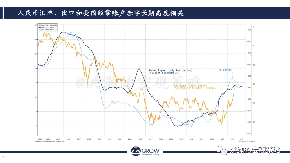 图四:人民币反映了市场对于美国经常账户赤字和中国出口周期的预期
