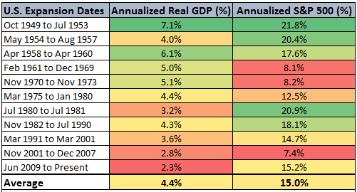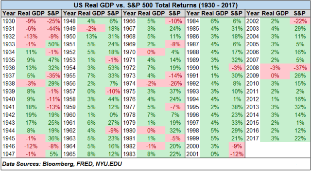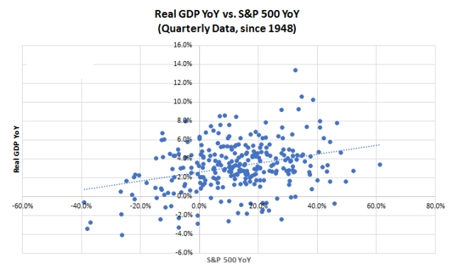 从1930年开始,标普500大盘的回报和真实GDP增长的相关程度为0.26: