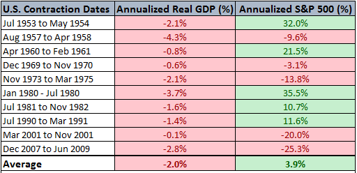 过去10次经济衰退中,有5次股市都表现出正回报,很多时候还有很高的回报。平均也有3.9%的正回报: