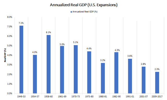 2018年第1季度,美国经济增长了2.3%,这正好是2009年6月以来美国经济增长的平均值,而这也是二战后所有经济增长周期里增长最慢的牛市: