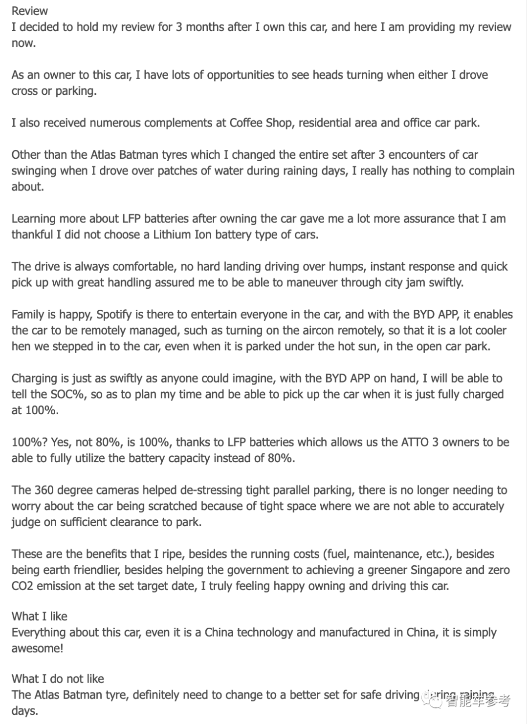 一位车主直接写了一篇长文,夸比亚迪ATTO 3的外观让自己获得了很高的回头率,车辆开起来非常舒适,远程APP可控制车辆的功能很方便,还有360度摄像头防止停车时出现剐蹭,“中国技术、中国制造简直是太棒了!”