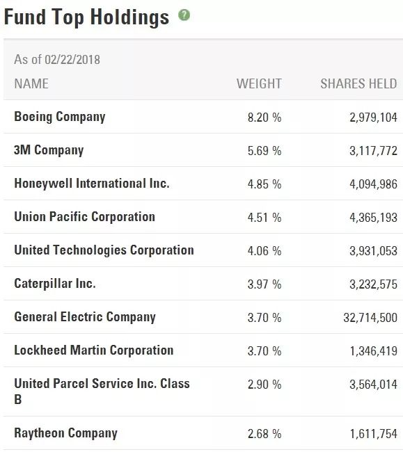 而XLI的前10权重公司有:波音,3M,霍尼韦尔,联合太平洋铁路,联合科技,卡特彼勒,通用电气,洛克希尔马丁,UPS邮递,和雷神公司: