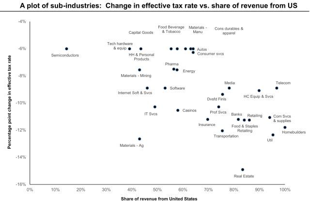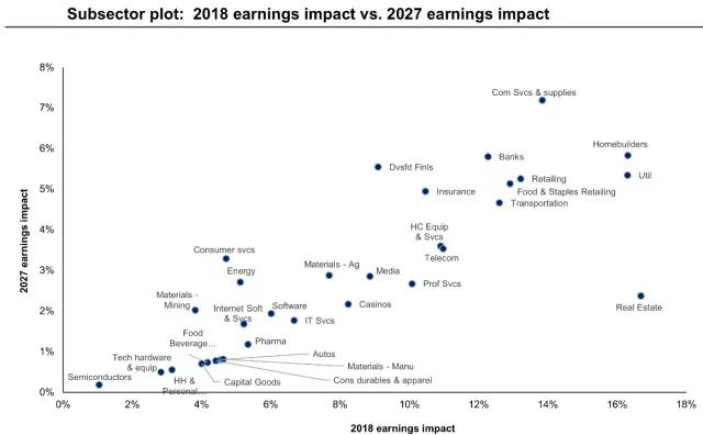 细分到每一个行业的盈利如下图。横轴是税改2018年对各行业盈利的影响。而纵轴是税改2027年对各行业盈利的影响: