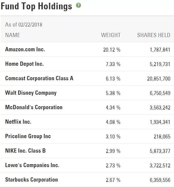而XLY的前10权重公司为:亚马逊,家得宝,康卡斯特,迪斯尼,麦当劳,奈飞,普利斯林,耐克,劳氏公司,和星巴克: