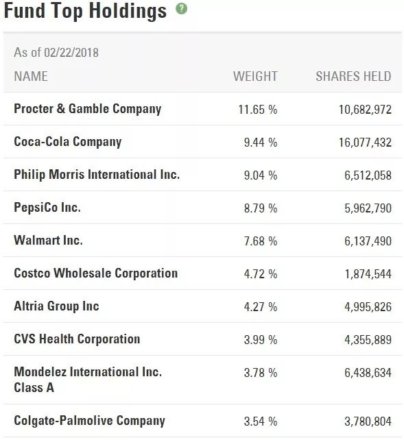 XLP的前10权重公司为宝洁公司,可口可乐,菲利普莫里斯烟草,百事可乐,沃尔玛,好市多超市连锁,奥驰亚烟草,CVS健康,蒙德雷兹食品,和高露洁: