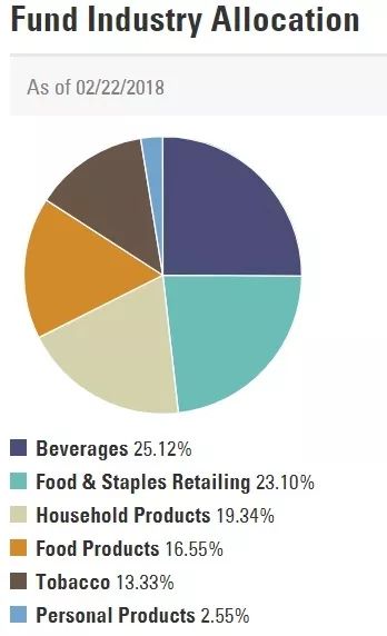 XLP的行业组成里,25%是饮料业,23%是食物和必需品零售,19.34%是家用产品,16.55%是食物产品,13.33%是香烟,等等: