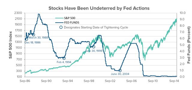 很显然,投资者们都倾向于第2种。特别是机构投资者。机构投资者的矛盾在于,他们也知道股市太贵,但历史上,在各种股灾前,美联储开始加息之后,都有2-3年的股市疯狂加速期: