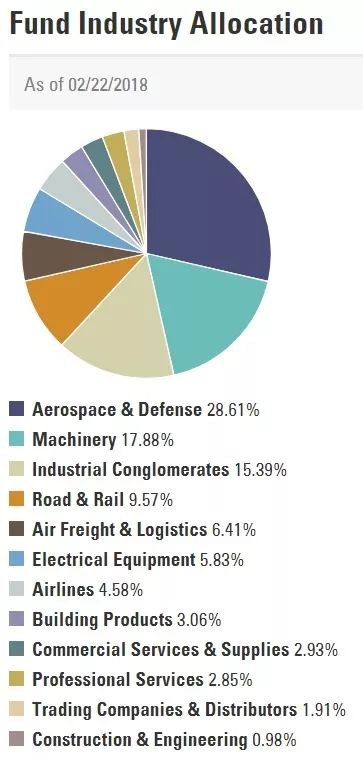XLI的行业组成中,28.61%在航空航天及国防,17.88%在机械,15.39%在工业综合巨头,9.57%在铁路公路,6.41%在物流空运,等等: