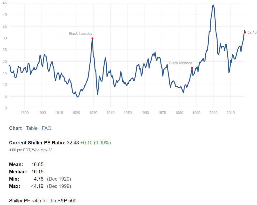2018年,很多机构投资者的担心,是美国股市现在太贵了。一个经常被引用的衡量股市便宜或贵的指标,席勒PE市赢率,已经到达空前的高估值区域,32-33倍。大大高出07年股灾前的27倍,甚至高过1929年股灾前的30倍,仅次于2000年科技股灾前的45倍: