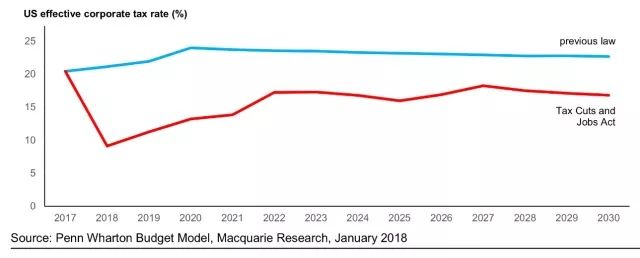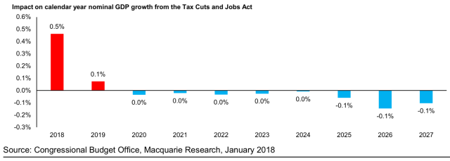 麦格理分析,川普税改对GDP增长的提振作用,集中体现在2018年,帮助GDP多增长0.5%,而这个数值到2019年只有0.1%, 而2020年后会开始拖累GDP(财政赤字等因素):