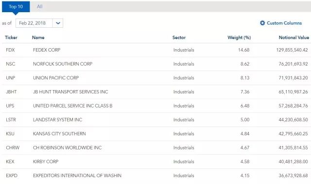 而IYT的前10权重公司为联邦快递,诺福克南方铁路,联合太平洋铁路,JB亨特运输,UPS快递,LANDSTAR运输系统,堪萨斯城南方铁路,罗宾逊全球物流,等等: