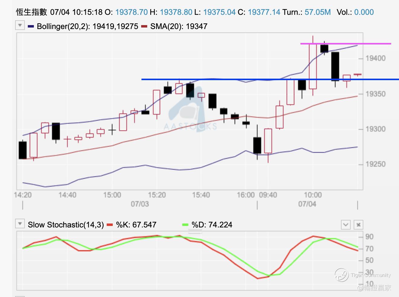 恒指今早开市微跌17点,开市报19289点,呢个点数确实是无咩可以做。到恒指开市之后见佢稍稍向下,但落到五分钟图保历加通道底线后又再弹返上去,依家10点11分,指数暂时最高见过19432点,将熊证第一层街货全数收回,不过呢度相当于25张期指,少到连前菜都称唔上,而19400至19499点嘅熊则有相当于385张期指,打上嘅都有唔少,开始有肉食嘅。