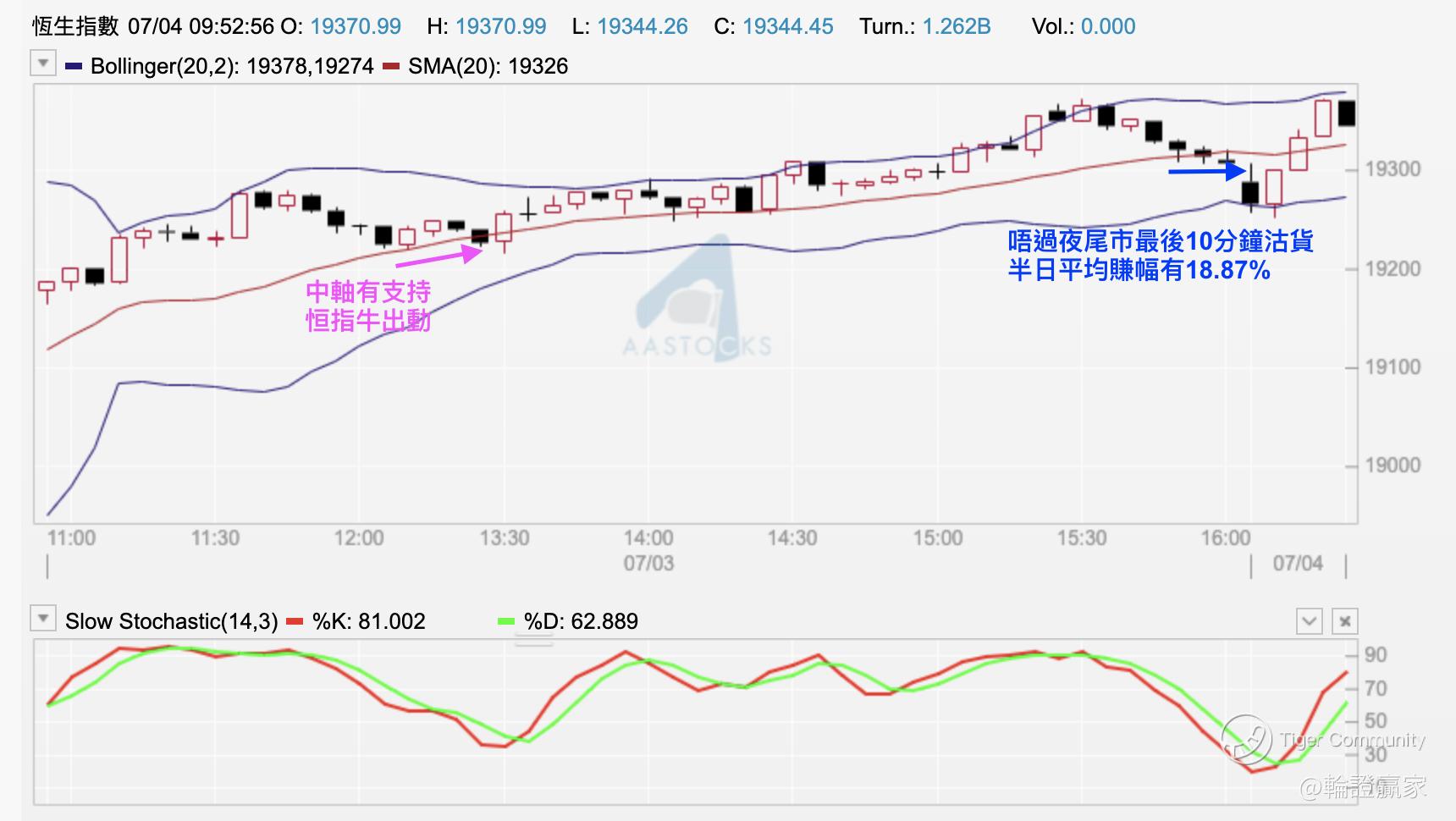 落场后大家都知都下半场往往比上半场行得慢,但唔紧要,方向啱就得啦,喺落场后计,指数大约用咗差不多一个钟嘅时间咬住保历加中轴慢行,去到2点半忽然跳高,将恒指一下子迫上19300点,同时将19200至19299点嘅熊证全数吞埋,嗰度都有600几张期指街货架。