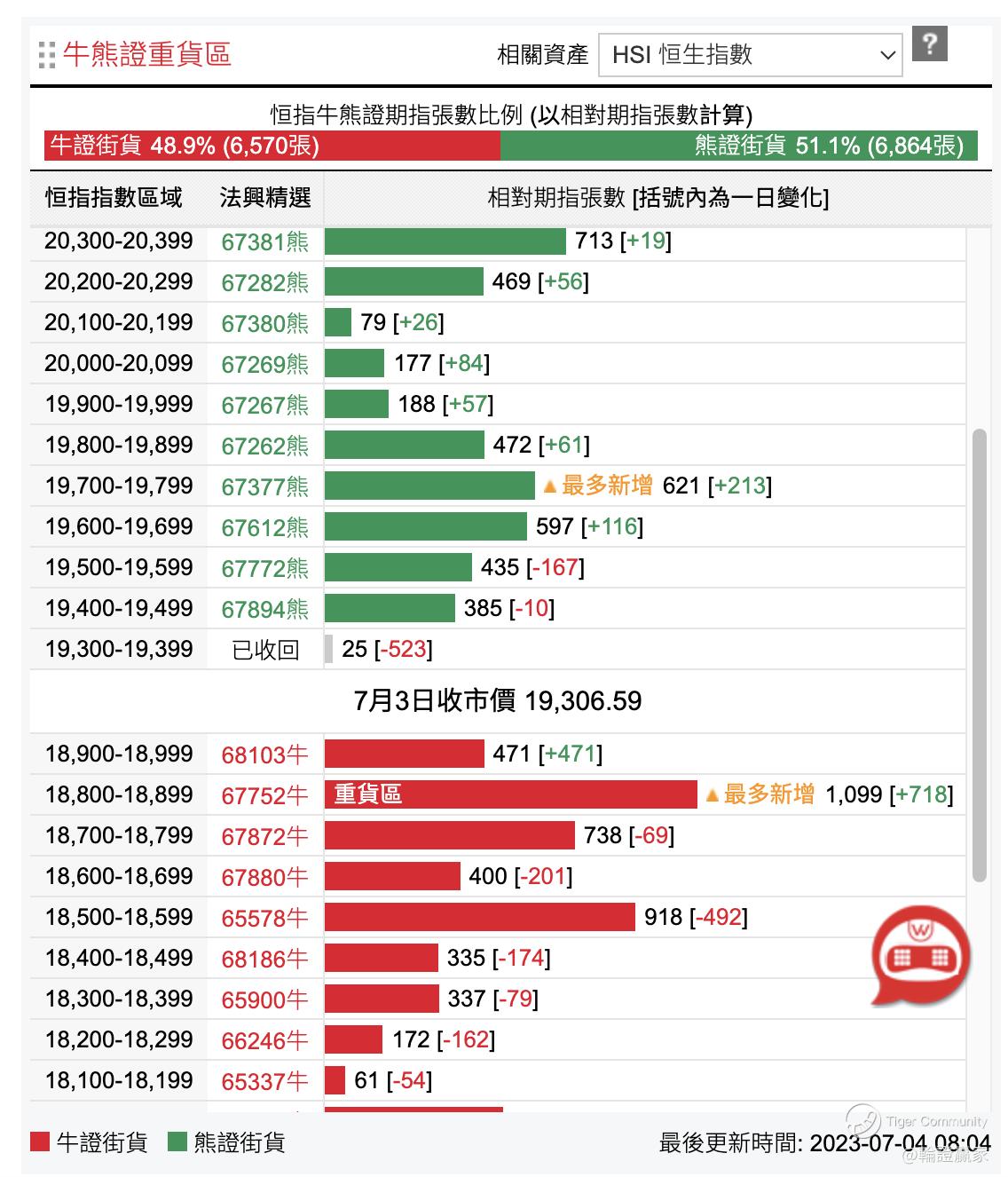 至于牛证方面,今日见有一层新增街货层,最贴价见18900至18999点,虽然有新货,但系同现价都有400几点差距,虽然未至于擘到好阔,不过假如指数再向上杀熊嘅同时,下方牛证出唔切的话,咁牛熊嘅差距又会再次拉阔,同之前情况有啲似,不过系指数一味靠近牛证街货而熊证又老年咁远,令指数不停向下。如果今次街货同指数嘅摆位相反的话,咁指数见升指日可待。