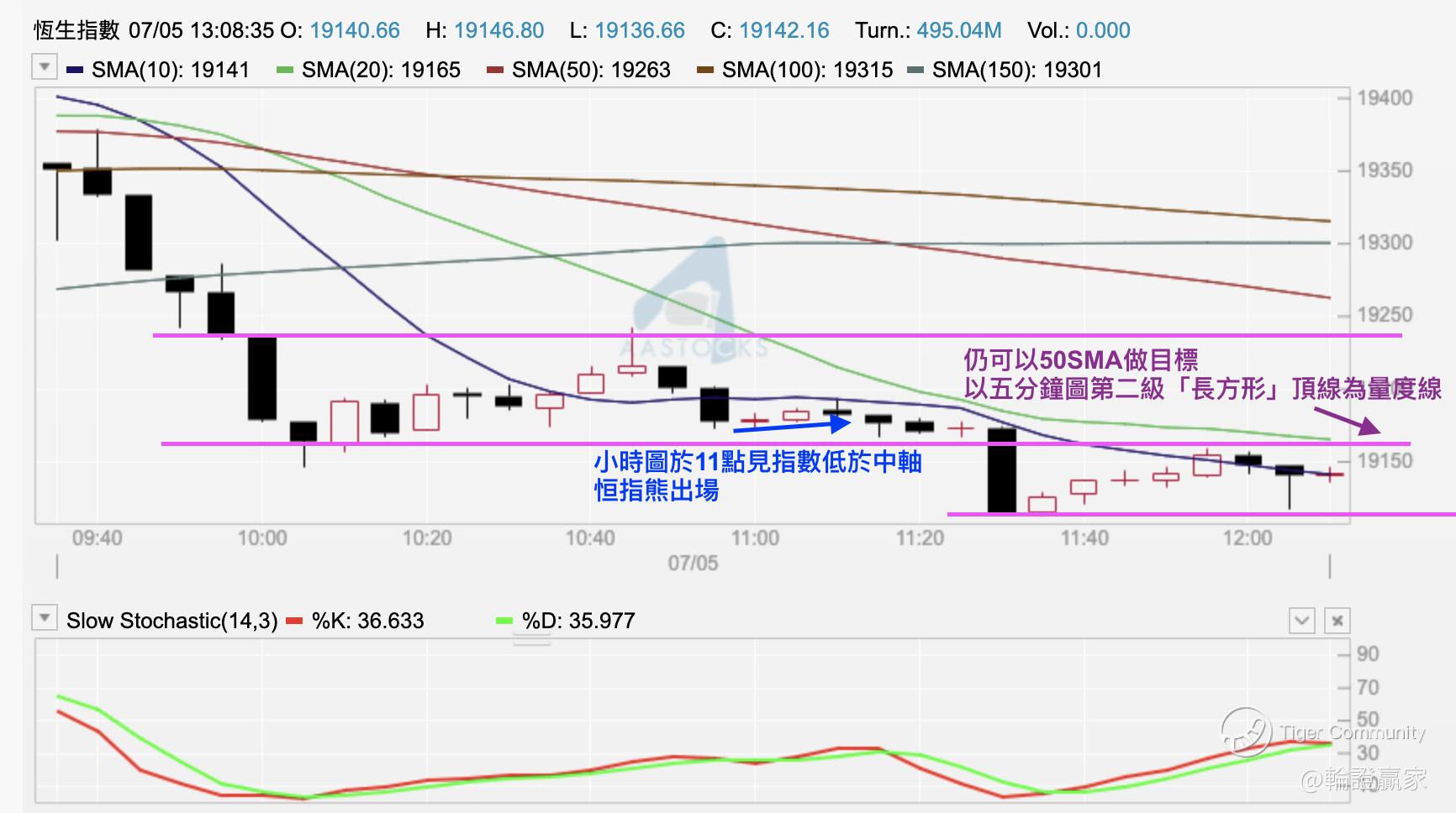 咁样啦,小时图50线暂时目标不变,但同时间Set定以五分钟图第二级嘅「长方形」顶线只量度线啦;小心有时喺下半场港股都会发下神经架。