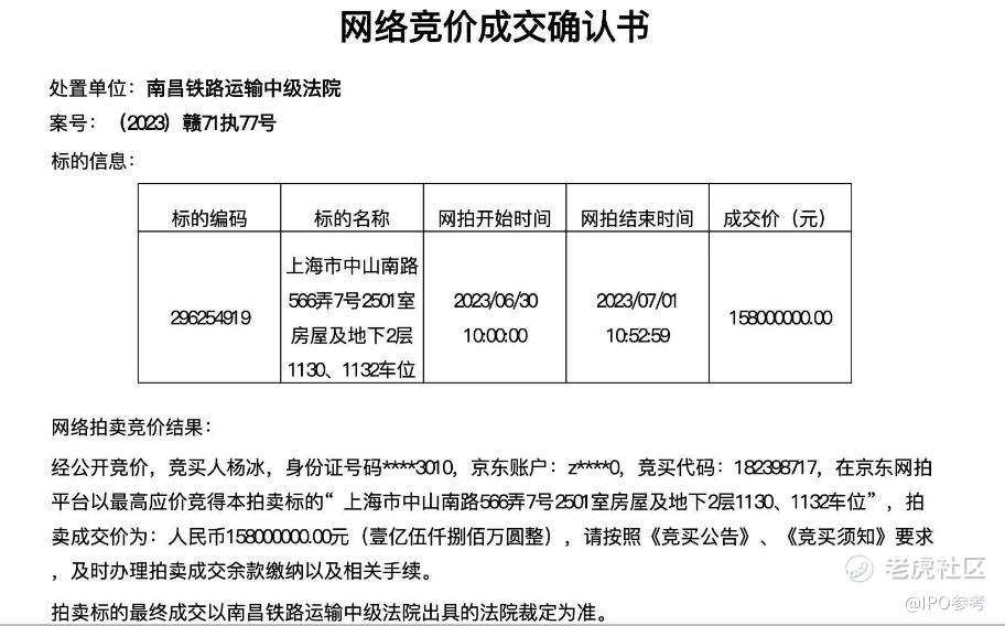 【得物回应创始人1.58亿买豪宅:不做评论】7月5日,针对网传的"得物创始人杨冰以1.58亿元的价格购得上海一处房产"的消息,记者向得物求证,对此,得物相关负责人回应,暂时不做评论。 记者在京东拍卖官网中看到,竞买人杨冰通过公开竞价,以1.58亿元的价格竞得了一套位于上海市中山南路的一套房产,处置单位为南昌铁路运输中级法院。该套房产建筑面积为459㎡,还包括两个超过55㎡的车位。 据了解,该房屋的拍卖吸引了超过1.6万人围观,最终有3人报价,最终在经过39轮报价后成交,以建筑面积来算,该处房产的成交单价超过了34万/平米。 (北京商报)