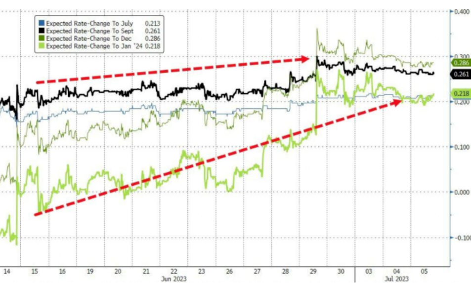 在这份比较纯粹的鹰派纪要发布后,市场对于未来加息的计价也应声走高,未来7月,9月,12月,甚至是明年1月份加息的预期都在同步走高