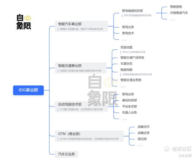 原来的组织架构,是李彦宏从实现自动驾驶的技术角度出发,先研发L4级别自动驾驶,再降维辅助驾驶,用车路协同做支撑,于是有了IDG三大核心部门,自动驾驶事业部、智能汽车事业部和智能交通事业部。