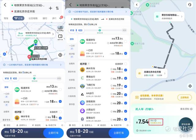 以我们的第一单为例,从荣京东街地铁站到亦庄龙湖天街,全程大约7公里,萝卜快跑的价格是7.54元,但同样的路程用高德打车,则大约需要20元。
