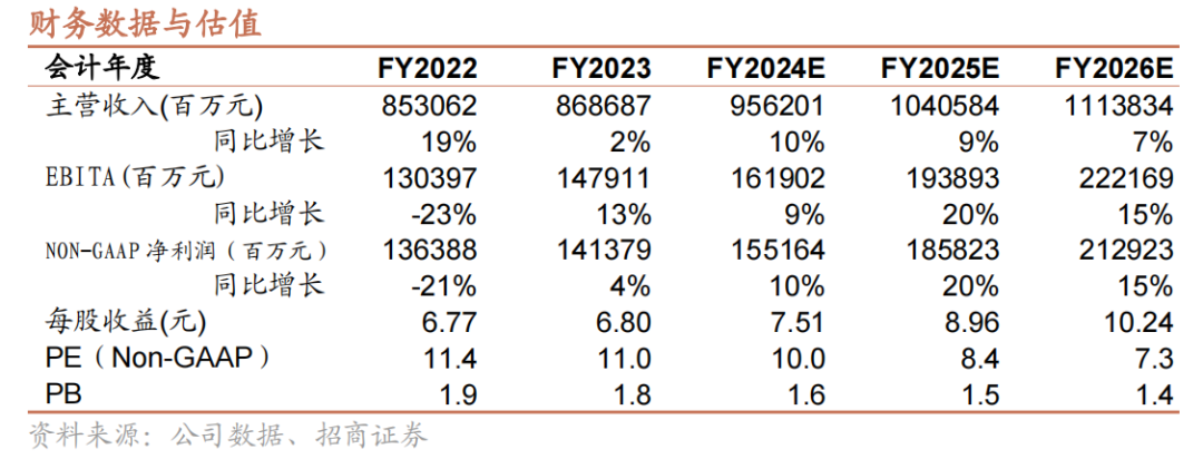 投资建议:6月季度消费复苏趋势持续,电商主业预计恢复稳健正增长,长期看淘宝天猫“多”、“好”竞争力稳固,国际商业、云计算、本地生活等业务有望持续贡献高增量,我们预计FY2024-2026财年收入分别为9562/10406/11138亿元,Non-GAAP净利润分别为1552 /1858 /2129亿元,维持“强烈推荐”评级。
