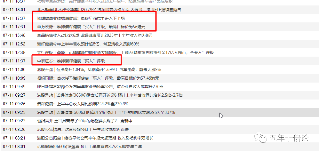 (1)业绩炸裂,毛利率比肩茅台。诺辉健康(06606)7月10日盘后在港交所发布2023年中报盈喜预告。据审计前财务数据中位数,截至2023年6月30日,诺辉健康上半年营收超去年全年,达到8.2亿元(单位:人民币,下同),保持三位数百分比高速增长。诺辉健康预计,上半年总收入约8亿元至8.37亿元,同比增长254.2%至270.8%。毛利约7.3亿-7.54亿元,同比增长294.6%至307.3%。毛利率预期为87.3%至94.3%,较去年同期的82.0%持续攀升。