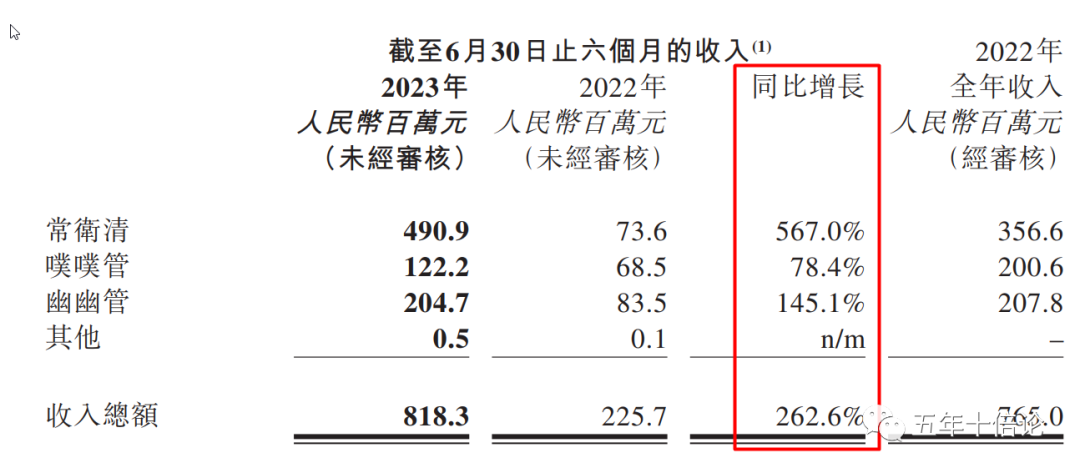 (2)产品销售爆发式增长,体外癌症检测赛道或打开。诺辉健康上半年总收入及毛利增长主要归功于常卫清、幽幽管和噗噗管三款上市产品的收入及毛利提升。分产品来看,作为国家药监局唯一获批的癌症早筛分子检测产品,常卫清的销售增长最为明显,是诺辉健康的“现金奶牛”。中报业绩预告显示,2023年上半年,常卫清的销售收入预期将介乎4.81亿元~5.01亿元,同比预增553.4%~580.6%;常卫清的销售所得毛利预期将介乎4.44亿元~4.52亿元,同比预增695.2%~709.5%。