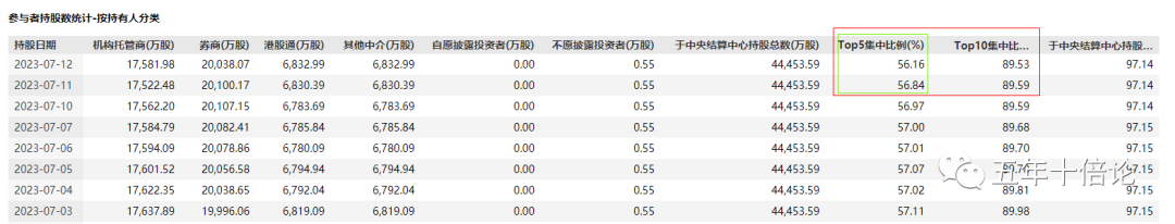 通过查阅“港股龙虎榜”,可以非常清楚的看到top5的持有人的持股比例在7月11日到12日下降太多,下跌了0.68%,远高于平时的减少额度,且Top10的持有人持有量并没有变化,所以,基本上是大户倒货给了中户,所以,在K线上也体现出成交量的大幅度扩大。