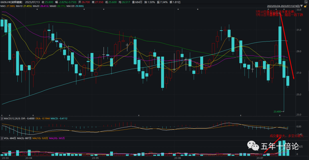 完全不像是业绩炸裂的应该有的行情表现,更像是业绩非常不达预期的表现。但是从成交量看,其实市场是有大量的投资者是看好诺辉健康的财报的,可能是卖空的一方力量过于强大,最终还是连续暴跌。