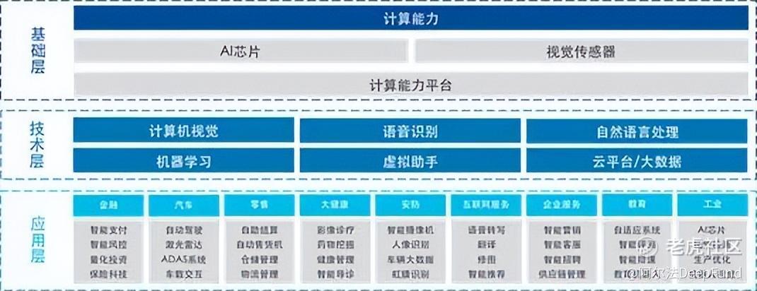 具体来看,AI产业链可以分为基础层、技术层和应用层三大部分。基础层主要提供硬件设备和软件服务,涉及AI芯片、云计算等领域,这些都是人工智能产业不可或缺的基础设施;技术层主要涉及算法研究和模型构建,技术层的创新是人工智能产业发展的重要驱动力;应用层主要涵盖了人工智能技术外延的应用场景,涉及金融、汽车、零售、大健康、安防、互联网服务、企业服务、教育、工业等诸多行业。